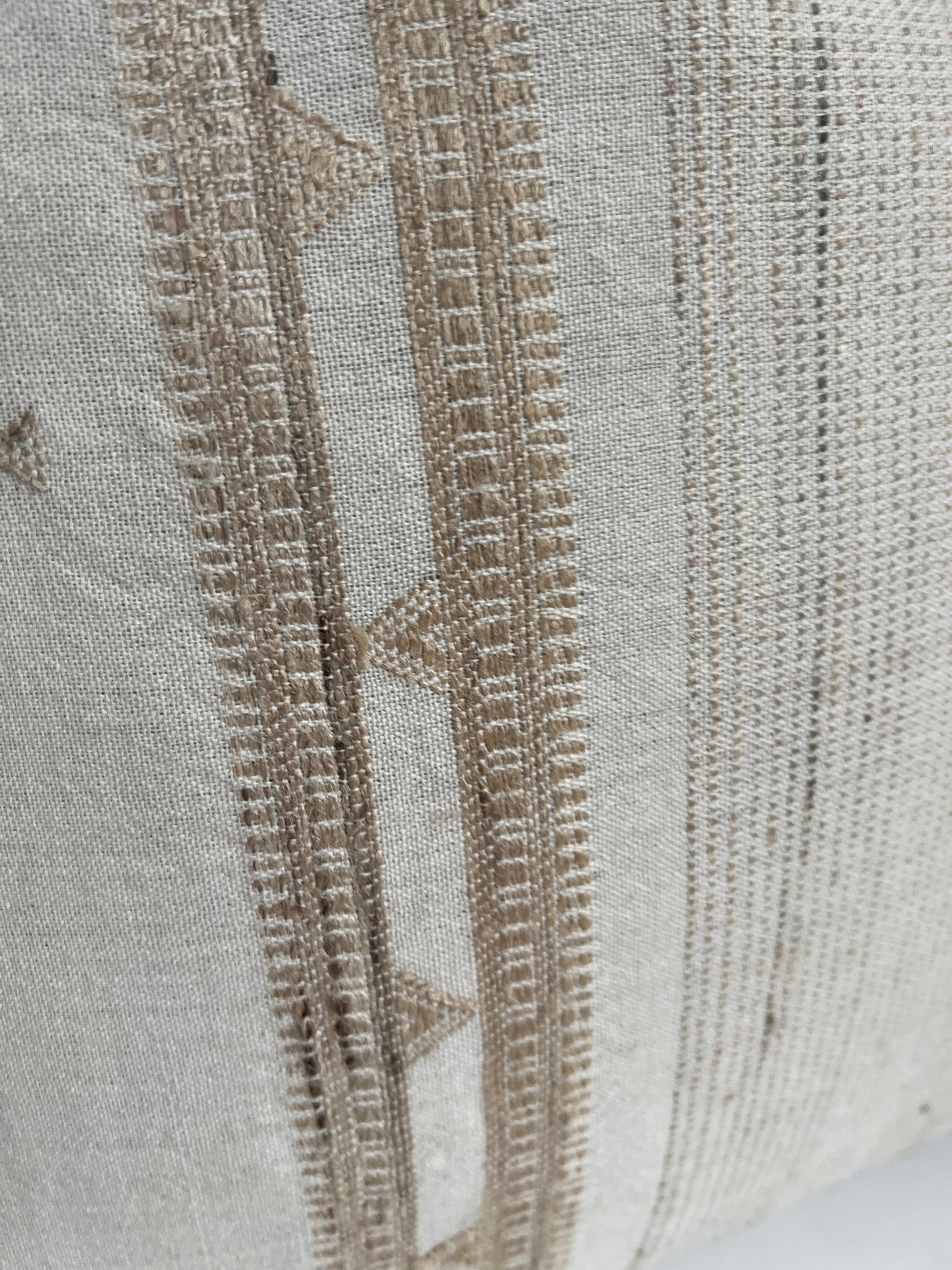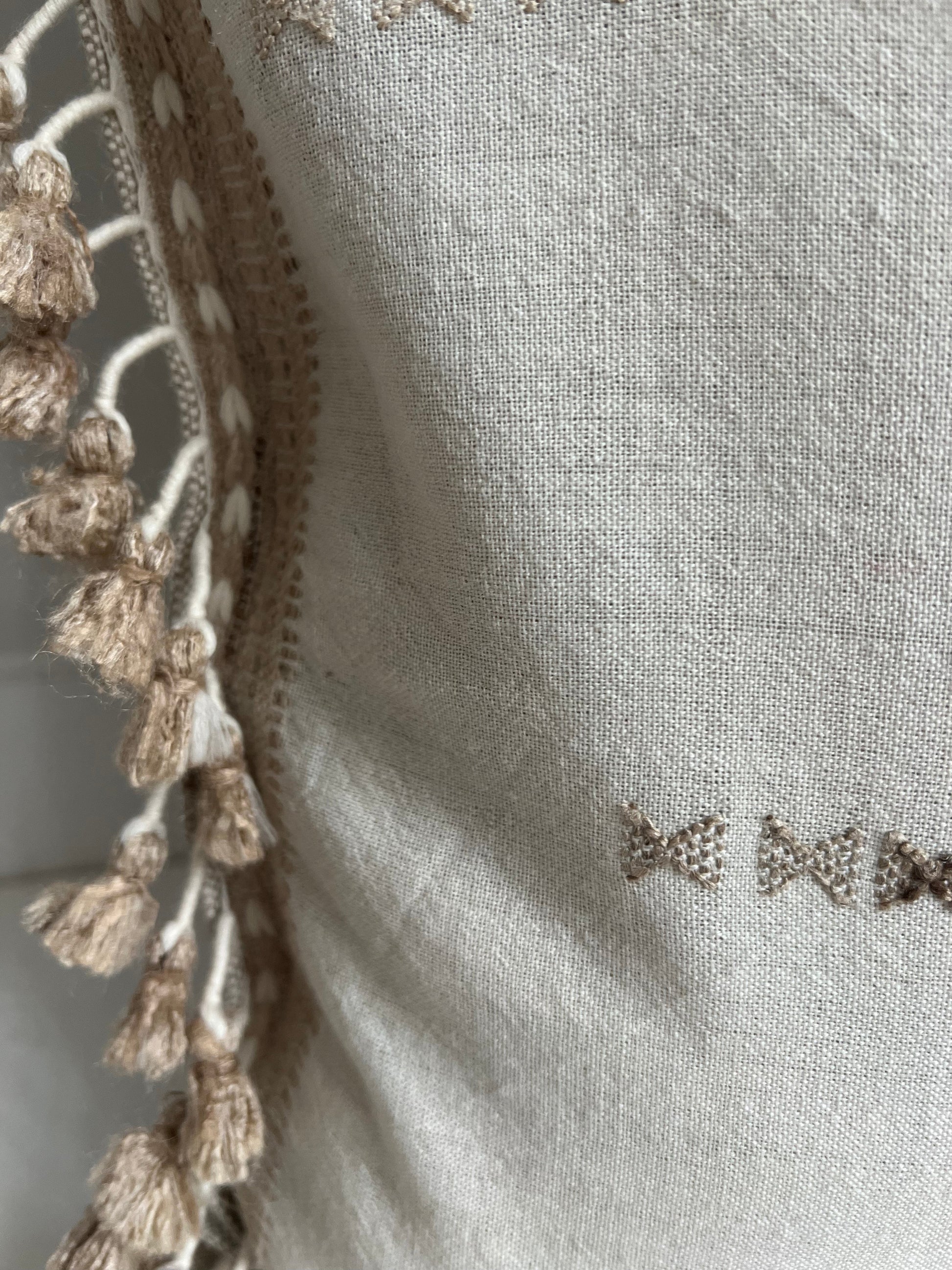 The Kyla pillow is a one-of-a-kind pillow made from a vintage textile with raw silk background containing neutral color embellished with natural embroidery and fringe.
