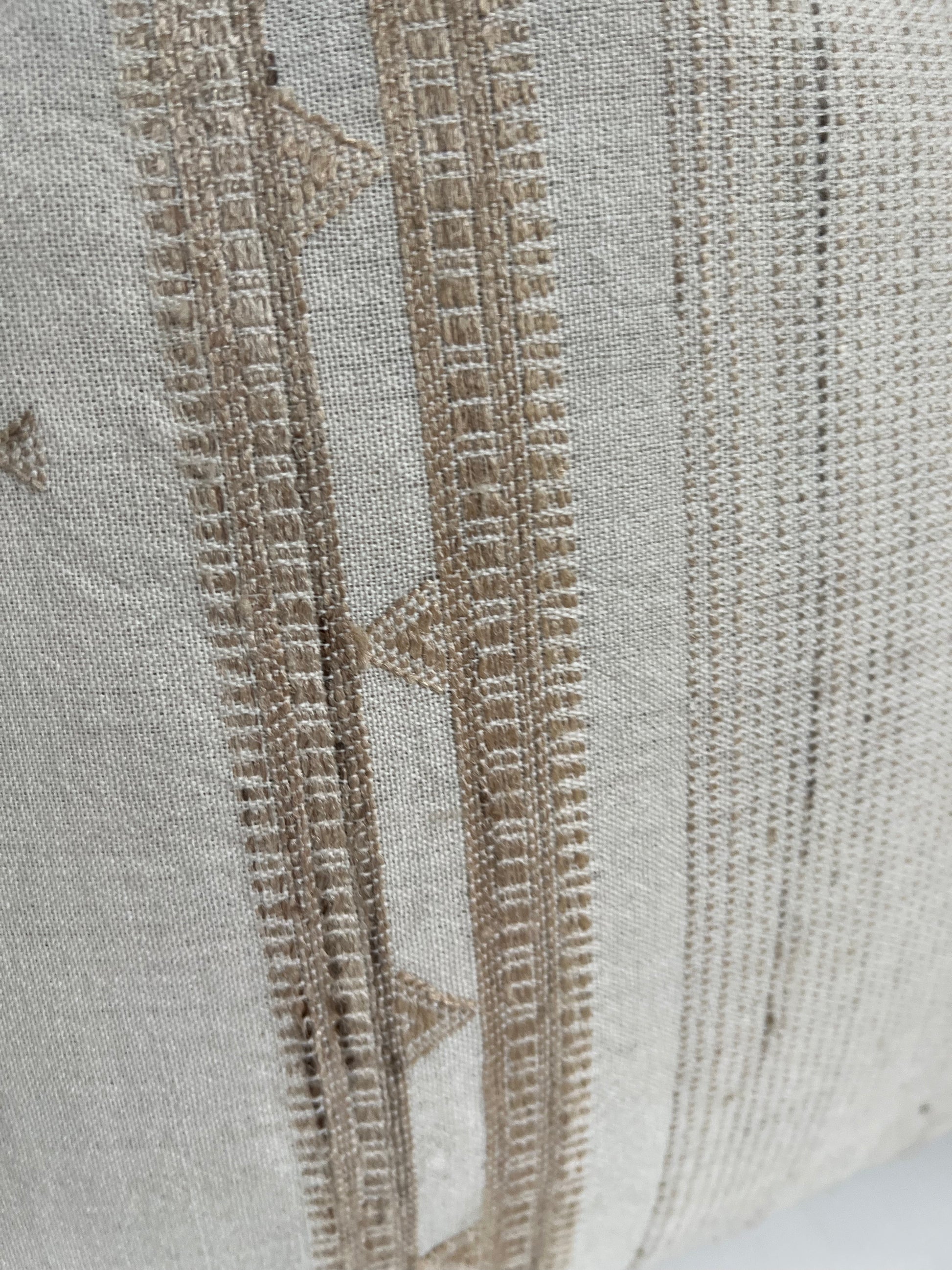 The Kyla pillow is a one-of-a-kind pillow made from a vintage textile with raw silk background containing neutral color embellished with natural embroidery and fringe.