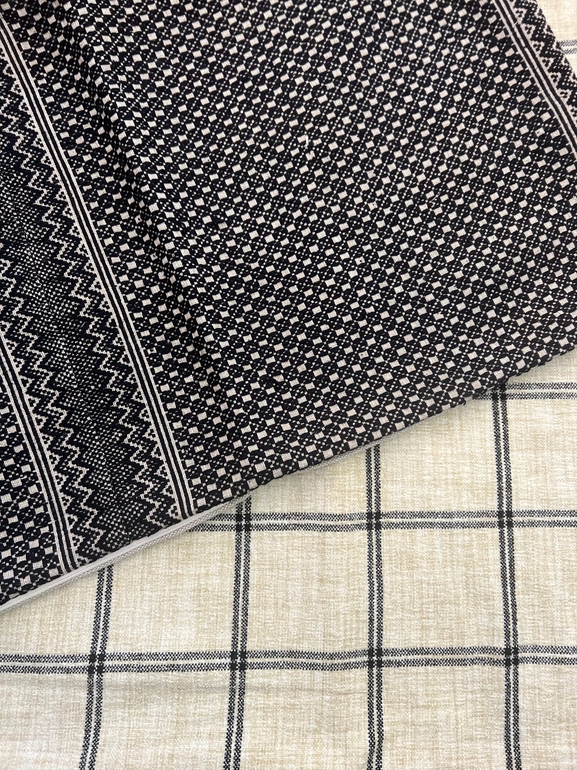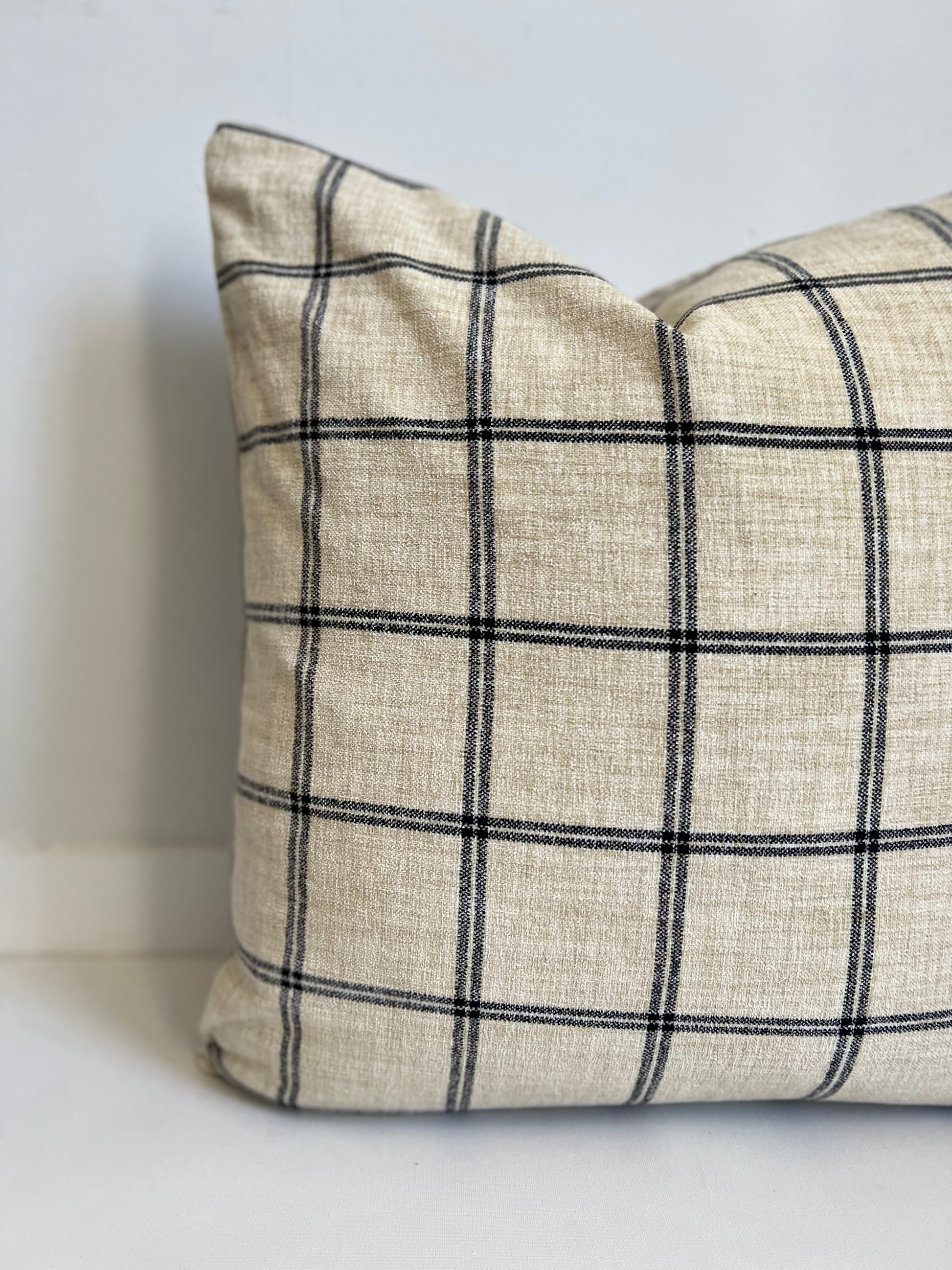The Neutral Plaid Pillow is made from a heavyweight textured fabric.